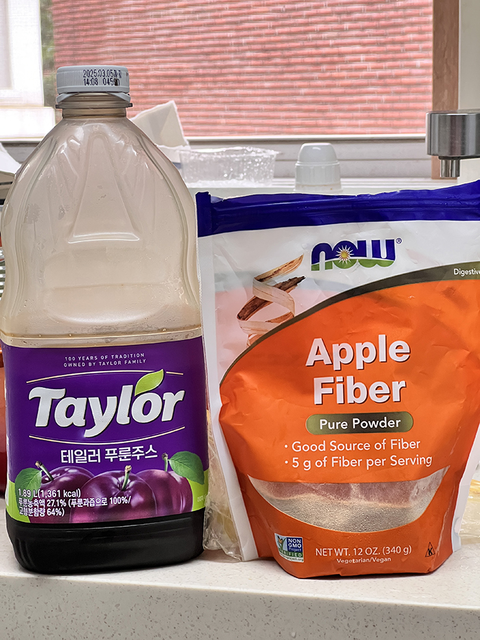 푸룬이 변비에 좋다는 얘기는 들어보신 적이 있으실 겁니다. 여기에 사과식이섬유를 조합해봤습니다. 사과식이섬유 또한 변비에 좋다는 정보를 접하고 이 두 개를 조합해봤습니다. 푸룬 쥬스 200ml에 사과식이섬유를 한 큰술 반 정도 넣고 섞어서 드리고 있습니다. 이 조합이 상당히 괜찮더라구요. 드릴 때는 몰랐지만 한동안 안 드리니 바로 변비가 찾아와서 고생한 기억이 있습니다. 그후에는 2일에 한 번씩 챙겨드리고 있습니다. 하루는 아기오, 하루는 사과식이섬유를 넣은 푸룬쥬스를 드리고 있습니다.