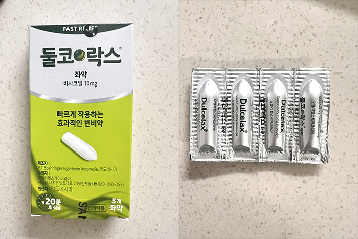 변비가 너무 심할 경우에는 둘코락스 좌약 적극 추천합니다. 집에 관장약도 있었지만 관장약은 액체라서 넣기가 많이 어려웠습니다. 요령이 없어서 그런지 샐 것 같아서 포기했습니다