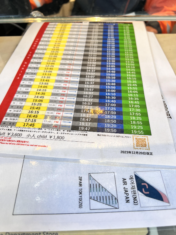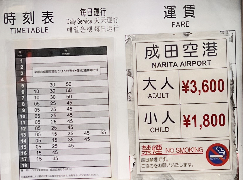 <신주쿠역에서 나리타로 가는 리무진 버스 시간표>