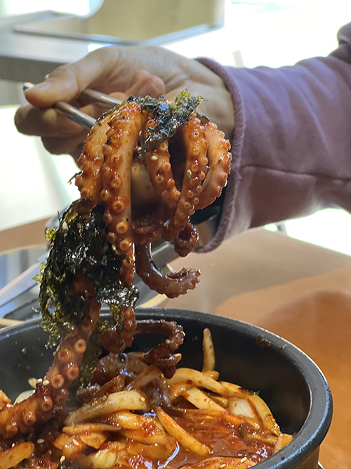 매콤한 낙지볶음 밑에 면이 깔려있는 그런 형식이었습니다.