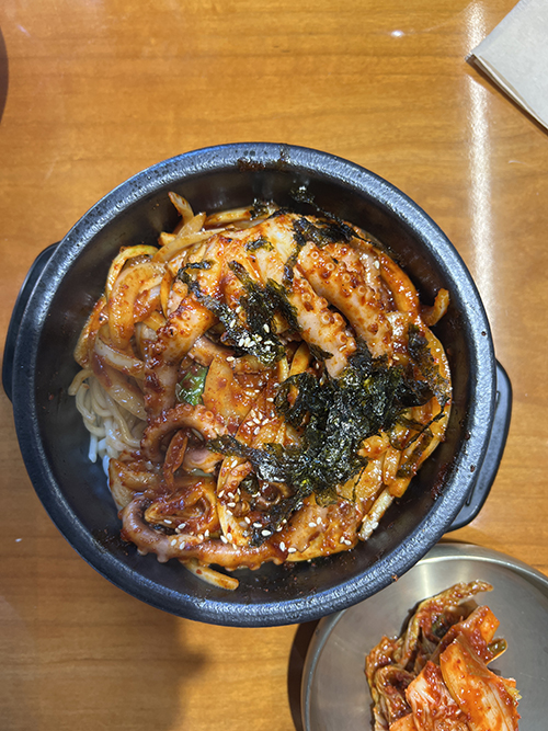 매콤한 낙지볶음 밑에 면이 깔려있는 그런 형식이었습니다.