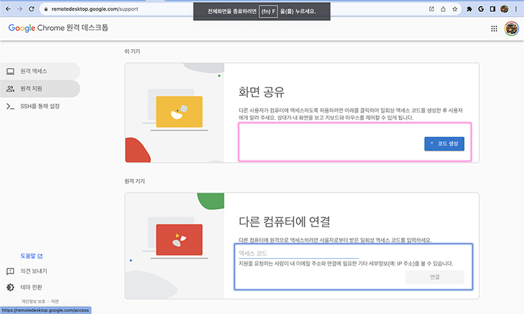 - 다른 컴퓨터에 연결할 때: 타인의 컴퓨터를 원격 조종하려면 상대에게 받은 코드를 입력 후 연결합니다.