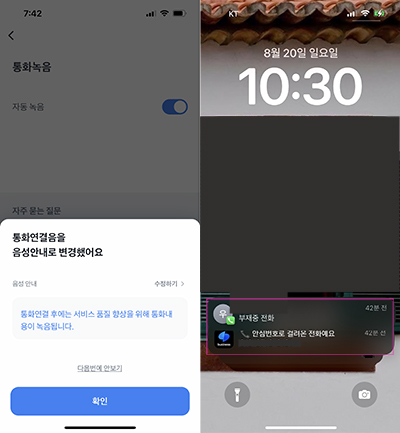 - 통화녹음도 가능하며 통화연결음 설정도 할 수 있습니다. 테스트 삼아 전화를 해봤는데 안심번호로 걸려온 전화라는 알림창이 뜹니다.