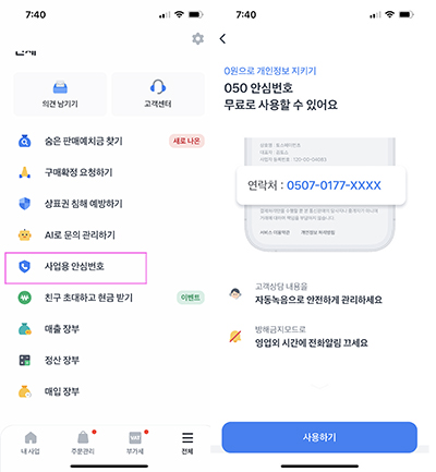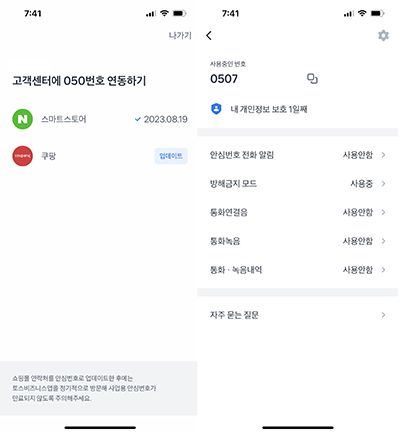 - 사용하기를 누르면 아래의 왼쪽 이미지에 나에게 할당된 번호가 뜹니다. 그리고 스마트스토어, 쿠팡 연락처에도 안심번호로 업데이트하는 데 동의를 눌러줍니다.